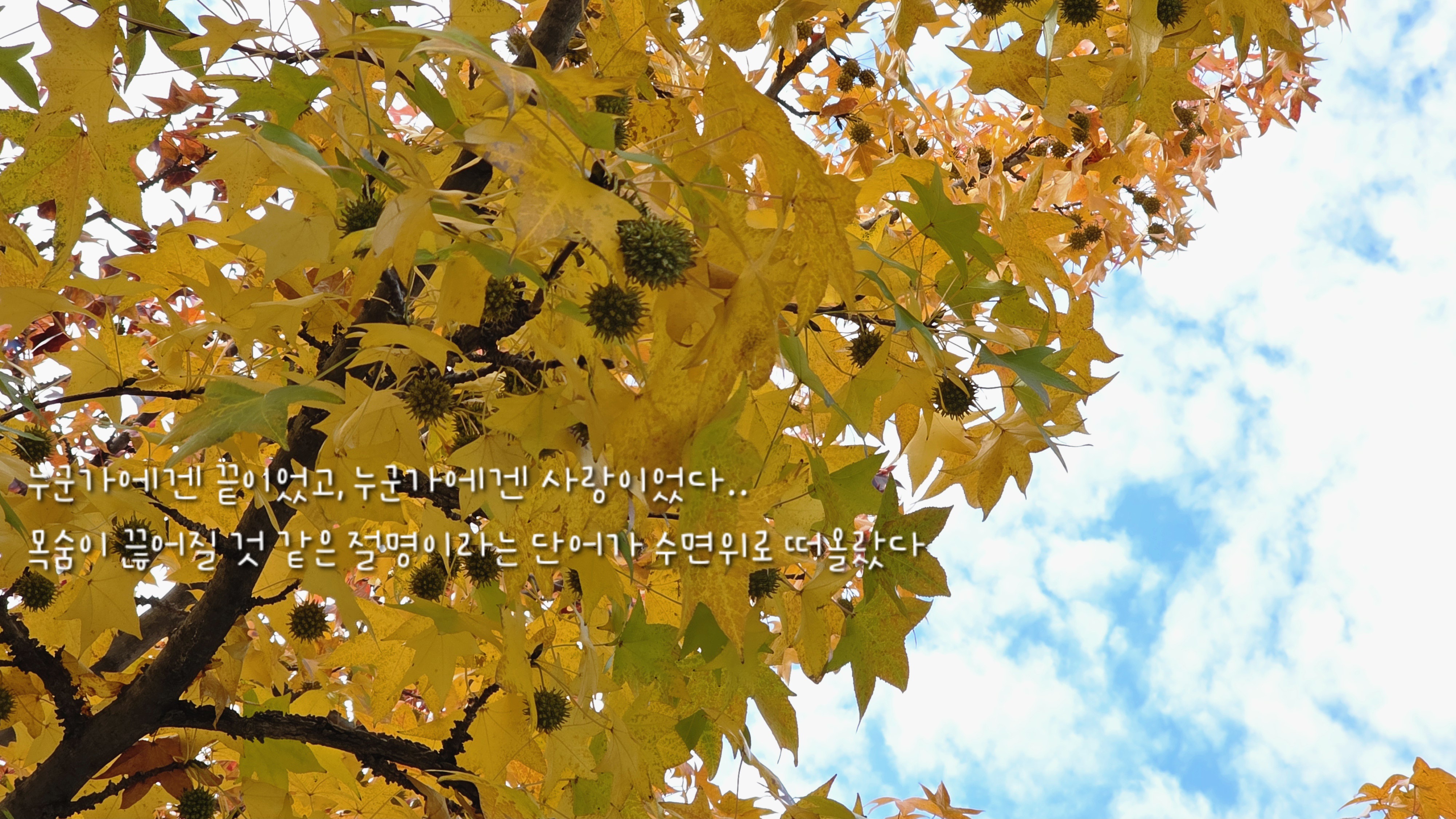 숙모도 내게 덧붙여 말하며 웃었어요. 그들은 내가 미련해 보이고 바보 같아 보였을 거예요. 떨어지는 낙엽에 사랑을 부여하고 소망을 붙잡는 나의 모습이요. 그래도 나는 멈추지 않았어요. 사랑을 불신하면서도 사랑을 믿는, 사랑을 잃고자 사랑을 하는 미련한 나는.. 그저 허황된 허무를 품고 사는 작가라고 알 테죠.
