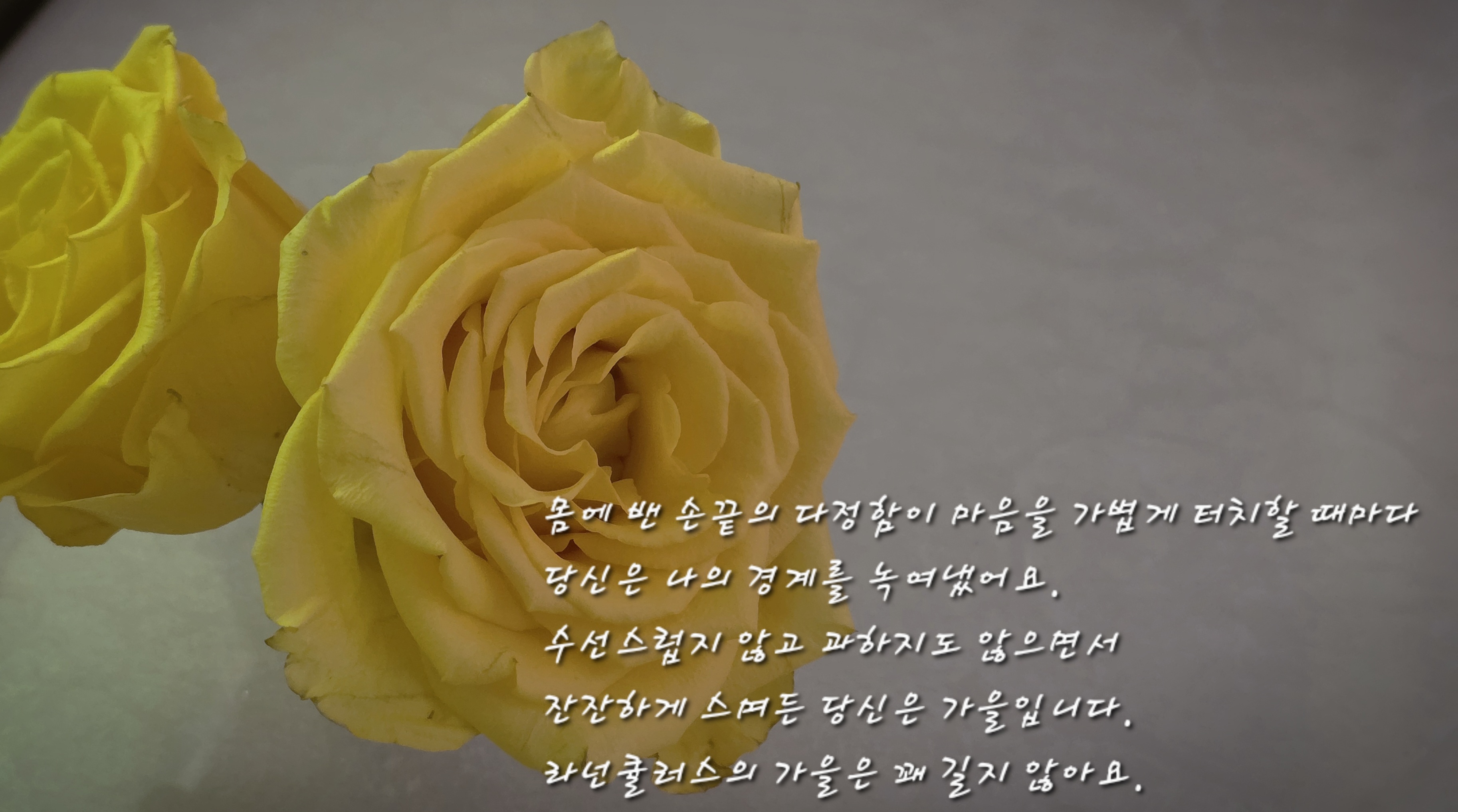 가을의 중심, 당신은 당신을 내려놓고, 나는 나를 내려놓았다. 그리하여 마침내 나는 당신에게 물들 수 있었고, 당신은 내게 젖었다. 가을의 절정이었다. 온통 가을만이 나와 당신을 맴돌았다.